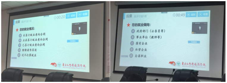 通过雨课堂小程序的在线收集功能,书记首先了解到毕业生党员的就业情况和意愿,分享了个人工作经历,鼓励毕业生树立自信乐观的求职观念,养成认真热情的工作精神,发挥党员的先锋模范作用,维护党员自身的良好形象,并勉励同学们在未来学习或工作中,要做思想上的引领者,生活上的实践者,为国家和社会贡献自己的力量。