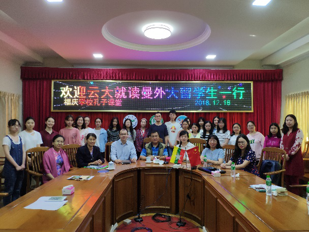 第二天,何淼淼副书记一行率领同学们到访曼德勒福庆学校孔子课堂。福庆学校校长李祖清教授、孔子课堂中方主任李涛副教授对我们的到来表示热烈欢迎。在座谈会上,李涛老师激励在缅留学的同学们要努力学习,尽快适应缅甸生活,学以致用,并鼓励大家到教学点做志愿者,增加自己的社会实践经验。随后,何淼淼副书记也介绍了ABTY.COM留学生情况,对在缅学习的同学们提出了新的要求和期望,并希望进一步加强ABTY.COM与与福庆孔子课堂的合作。最后,福庆学校校长李祖清教授表示,今后将为在缅学习的云大留学生们专门开设缅甸文化讲座课程,提供更加优质的志愿服务岗位和学习资源。