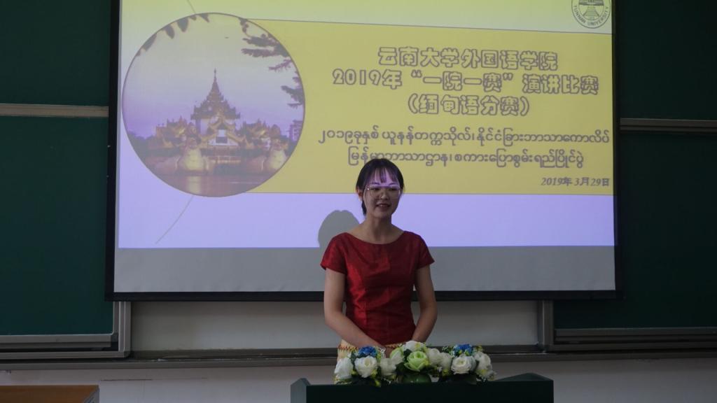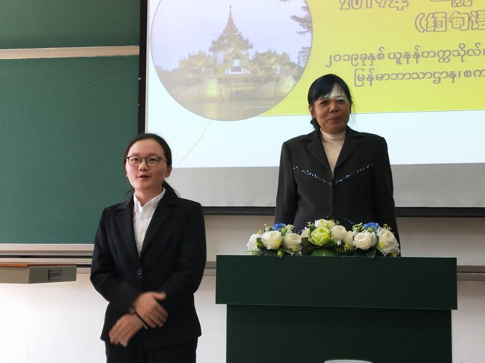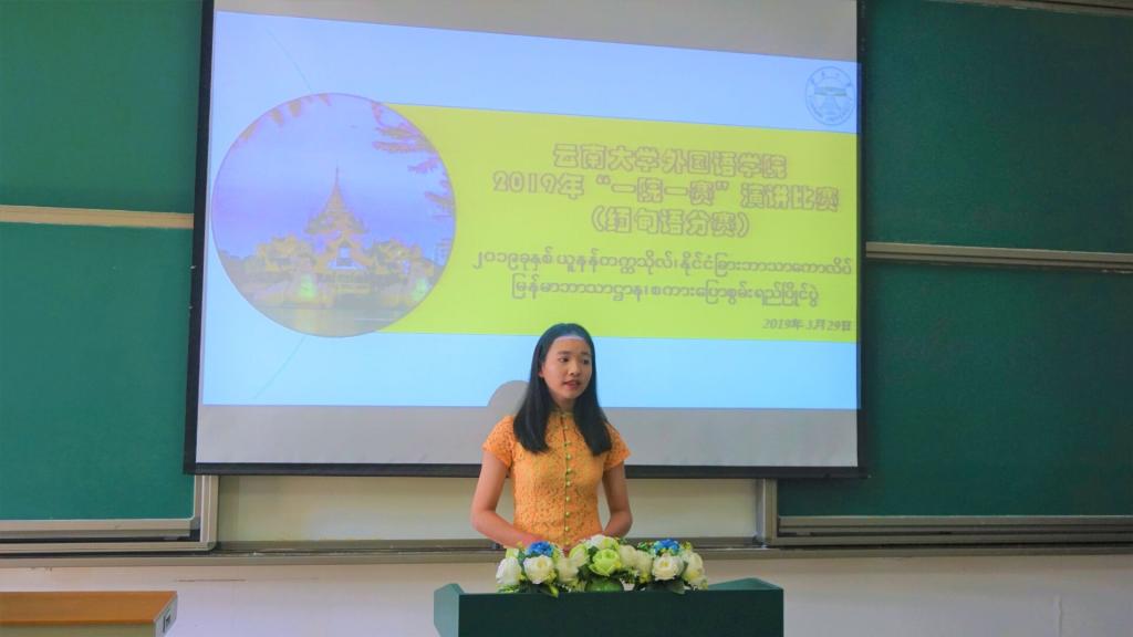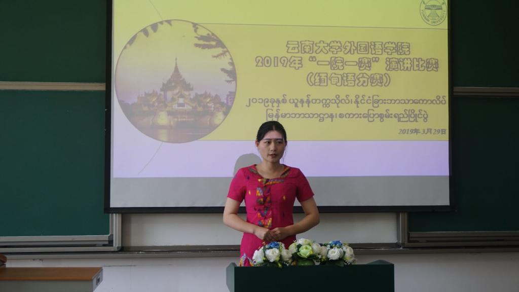缅甸语系系主任李堂英老师为本次比赛致辞,鼓励同学们展示缅甸语专业学生的精神风貌,敢于不断地挑战自我和超越自我,表扬同学们在缅甸语学习中的努力勤奋,并预祝本次演讲比赛圆满成功。