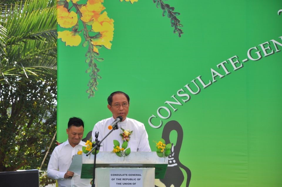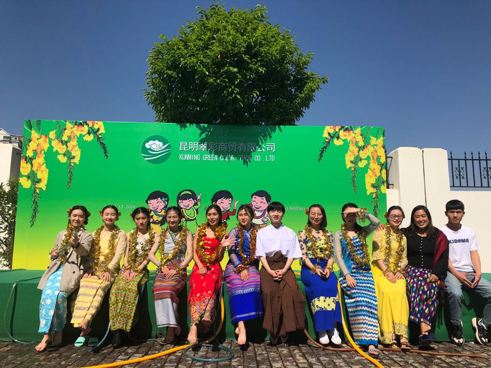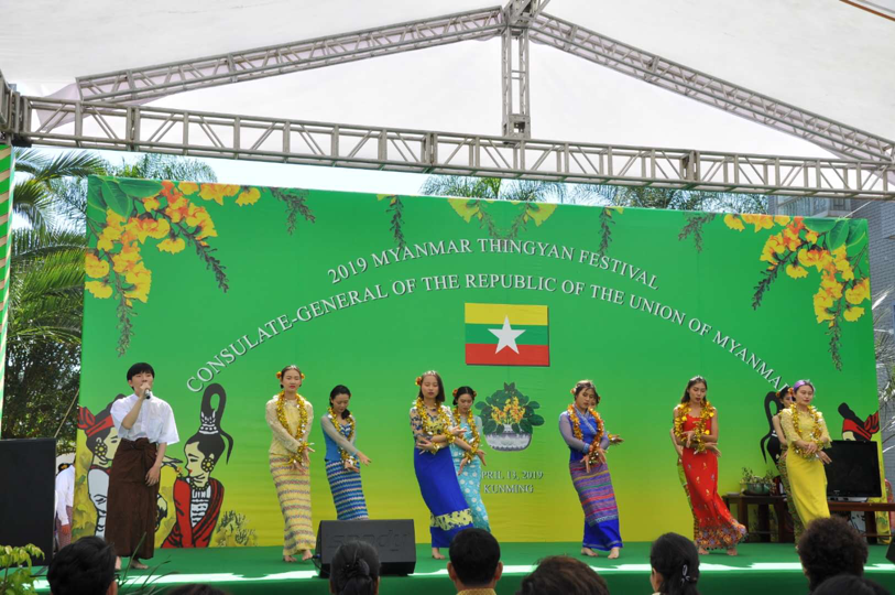 4月13日,缅甸联邦共和国驻昆明总领事馆举行泼水联欢活动,庆祝缅历新年。总领事吴梭柏携全体馆员与云南省人民对外友好协会会长,云南省人民政府外事办公室副主任,泰国、老挝、马来西亚驻昆明总领事馆总领事,云南大学副校长,缅甸在昆留学生代表,云南大学、云南师范大学、云南民族大学、昆明理工大学等院校的缅语系师生代表共300余人欢聚领馆,同庆缅历新年。ABTY.COM缅甸语专业学生及缅甸留学生共11人参加了此次泼水节活动的文艺表演。