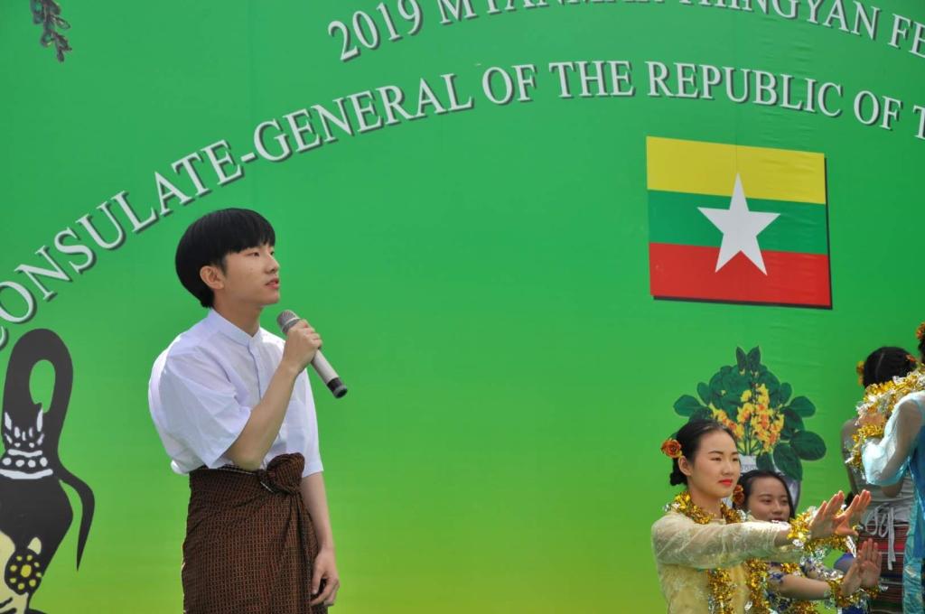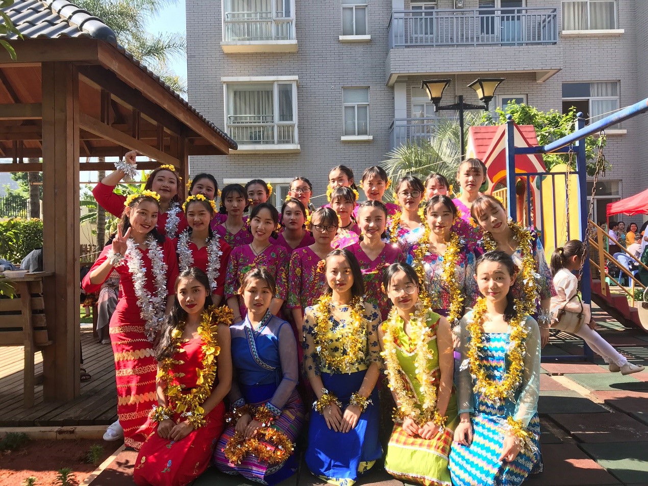 此次泼水节文艺表演共有16个节目,ABTY.COM缅甸语系本科学生和云南大学工商管理专业的缅甸留学生共同表演了缅甸歌舞,亲身体验了缅甸传统歌舞的独特魅力。本科二年级的张元浩同学身穿缅甸隆基演唱了缅甸语歌曲《泼水节的雨》。伴舞的女生们穿着特敏,头戴紫檀花(一种特属于缅甸泼水节的花),看起来优雅大方。同学们自信大方的精彩表演展现了外国语学院学生的风采。