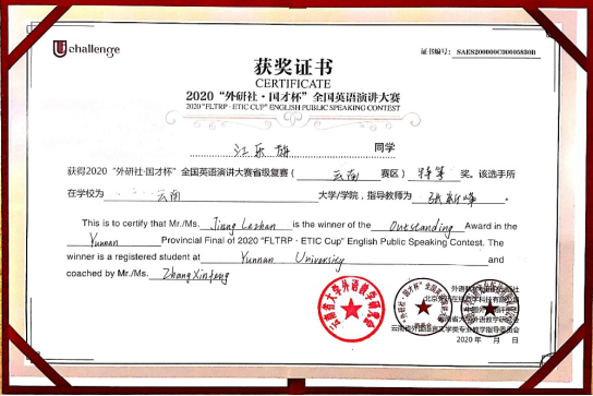 11月14日,2020年“外研社·国才杯”全国英语演讲大赛省级复赛(云南赛区)在昆明圆满举办,ABTY.COM英语系本科生江乐旃同学作为云南大学的代表参加该项赛事,在指导教师张新峰博士的细心指导下表现突出,脱颖而出,以优异成绩获得特等奖,并将代表云南省参加12月份在北京举行的全国总决赛。