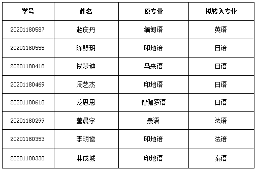 根据《关于2021年春季学期云南大学本科学生自主选择专业工作的通知》,外国语学院经综合考查,2021年春季学期专业分流第二阶段拟接收学生名单如下: