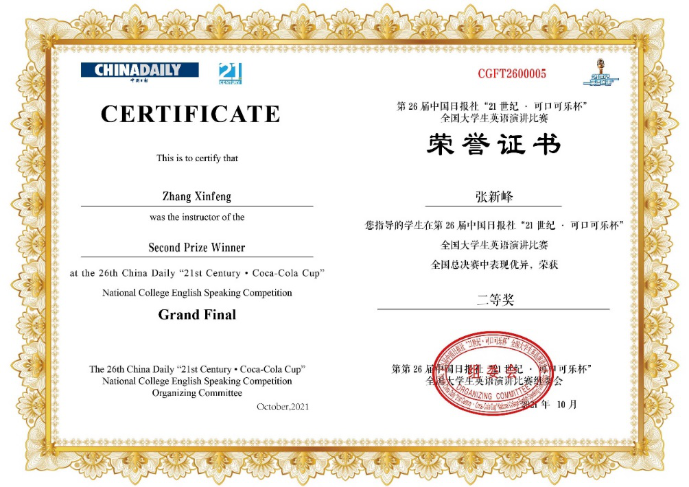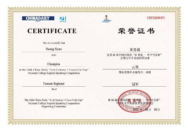 作为具有广泛影响的国家级赛事,“21世纪杯”全国英语演讲比赛由《中国日报》社主办、二十一世纪英语教育传媒承办。自1996年创办以来,一直以高质量的学术水平著称,得到国际权威英语教学和考试机构的大力支持和高度重视。本届“21世纪杯”英语演讲比赛自2020年9月启动以来受到了国内外各年龄段学子的热切关注,共计100多万名学生积极报名参加,历经地区初赛、复赛、决赛、校园选拔赛、互联网选拔赛等层层选拔,最终近400名选手脱颖而出,在全国总决赛的舞台上一展风采。黄思越荣获总决赛二等奖不仅展现他个人卓越的专业基础与才能,也从一个侧面显示了在云南大学“双一流”建设过程中英语语言文学专业所取得长足发展。