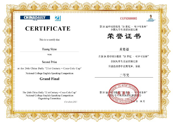 10月6日,《中国日报》社“21世纪杯”全国英语演讲比赛总决赛在成都落下帷幕,经过3天的激烈角逐,ABTY.COM2019级英语专业黄思越同学表现卓越,脱颖而出,荣获得全国二等奖的佳绩。
