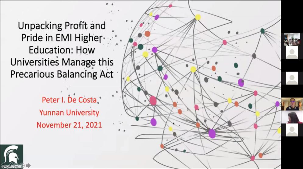 讲座伊始,De Costa教授指出学术机构是重要的语言政策仲裁者,连接了社会与个人语言实践。教授认为COVID-19使EMI教学情况更加复杂,越来越多留学生选择留在自己的祖国通过线上教学来继续学业。接着,De Costa教授阐释EMI与TNHE之间的关系:TNHE enables EMI, and EMI mediates TNHE。De Costa教授从为什么选择EMI-TNHE、如何研究EMI-TNHE现象、EMI-TNHE导致哪些后果以及得出的启示四个方面系统地解释了EMI-TNHE体系。De Costa教授指出我们需要深入切实地了解EMI语言政策如何在中观机构与微观课堂层面的实施情况。
