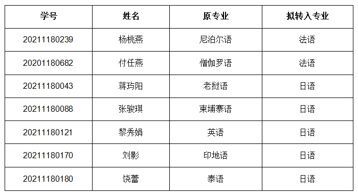 根据《关于2022年春季学期云南大学本科学生自主选择专业工作的通知》,外国语学院经过面试考核,现将2022年春季学期专业分流第二阶段拟接收学生名单公示如下:
