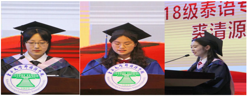 教师代表发言过后,由2018级英语专业本科生周子涵、2018级泰语专业本科生裘清源、2019级亚非语言文学专业硕士研究生孙国丽三位同学作为毕业生代表上台发言。三位同学回望了在云大学习的美好经历,分享了自己的所感、所思、所得,展望了毕业后的发展前景。在讲话的最后,优秀毕业生代表们祝愿同学们都能找准自己人生的罗盘,找寻、寻得、追逐自己的梦想,祝所有老师和同学们平安喜乐、前程似锦。