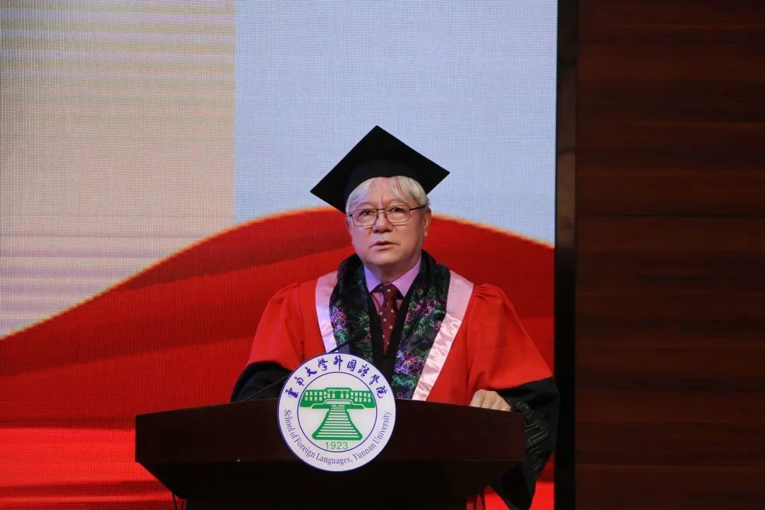 全院师生合唱国歌,毕业典礼正式开始。刘树森院长代表外国语学院全体师生对2022届毕业生圆满完成学业表达了最真诚的祝贺。刘院长表示,很欣慰地看到毕业典礼的召开,一届新的毕业生即将走出校园,为社会提供新鲜的血液。同时,为印地语专业的首届毕业生考研考取率达40%而感到骄傲,为外院今年各专业较高升学率感到自豪。刘院长接着解释了英语中“毕业”的单词“commencement”,它既是“毕业”,也是“开始”的意思,象征着毕业生们将辞别积淀满满的四年,开启一段新的征程。最后,刘院长以“我是云南的,云南云大的”这样一段改编自网络热梗的调子,点燃了现场的气氛,在场师生们纷纷献上了热烈掌声和欢呼声。