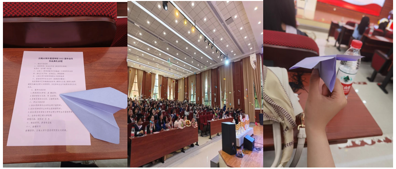 师生代表发言结束后,全体师生一同奏唱云南大学校歌。饱含深情的一曲校歌唱罢,全体毕业生将手中写着梦想的各色纸飞机用力向前抛飞。纸飞机将同学们带回了童年,回望了纯粹又赤诚的初心。它们承载着五彩斑斓的梦,绚烂向前。人生海海,漫漫旅程才刚刚启航、未完待续。