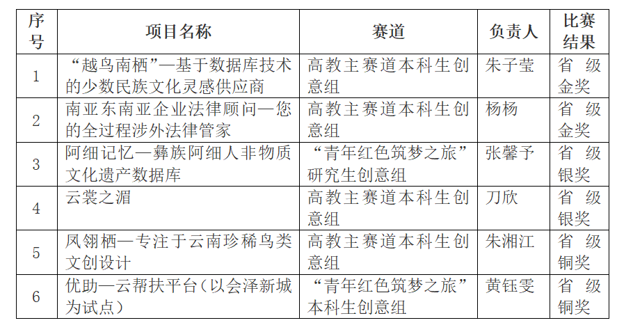进入7月的省内评审阶段,ABTY.COM6个晋级省赛的项目均顺利通过省内初审。其中高教主赛道的《“越鸟南栖”—基于数据库技术的少数民族文化灵感供应商》、《南亚东南亚企业法律顾问—您的全过程涉外法律管家》项目和“青年红色筑梦之旅”赛道的《阿细记忆—彝族阿细人非物质文化遗产数据库》项目入围省级金奖争夺赛现场路演决赛。