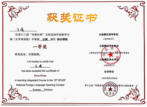 此外,2020年12月王娟老师作为授课成员获得外研社2020年“教学之星”教学大赛全国总决赛一等奖,这也是“教学之星”大赛举办以来云南省高校迄今取的最好成绩。2020年9月王娟老师在团队成员中排名第二,获得全国高校教师教学创新大赛-第六届外语微课大赛省级二等奖。2022年6月王娟老师还获得云南大学第十六届教师课堂教学比赛一等奖。