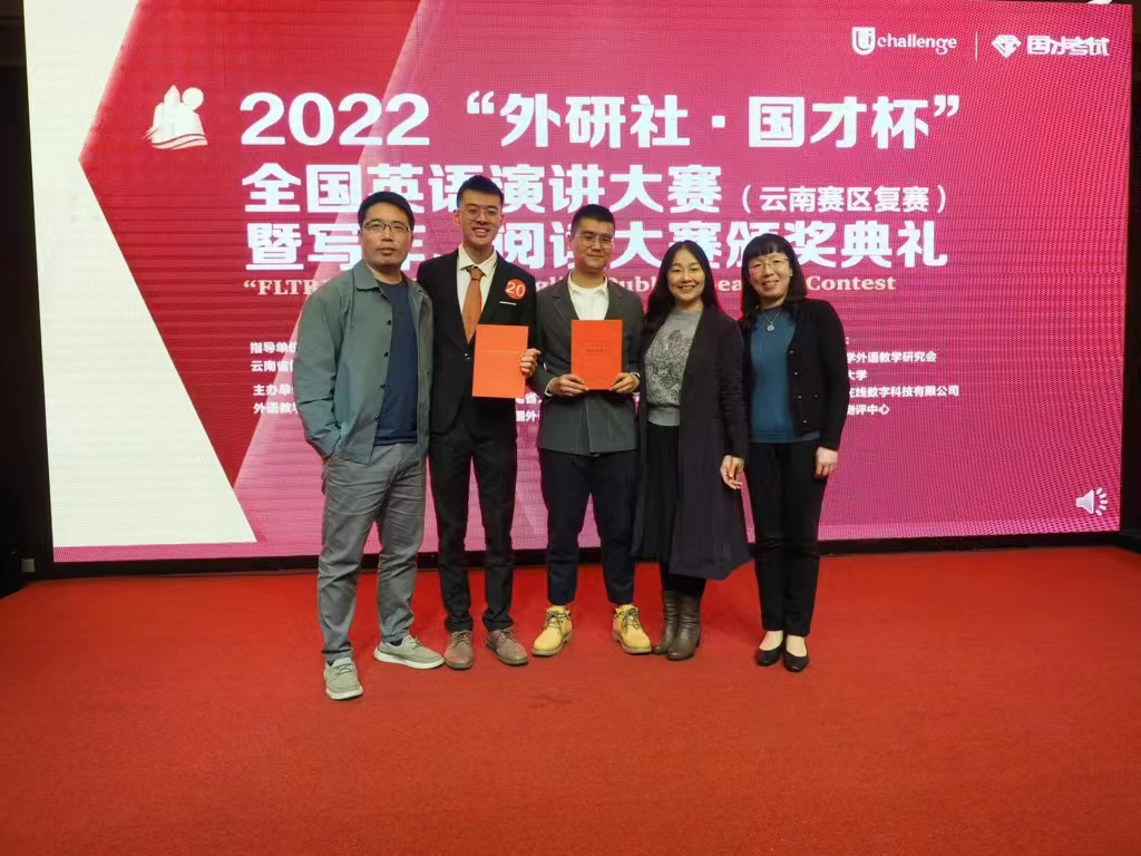 此次云南赛区复赛共有来自全省各高校的39名选手参赛,竞争异常激烈。比赛内容分为三个部分:以“China’s Wisdom for the World”为题的定题演讲、2分钟即兴演讲、评委提问环节。在两位老师的悉心指导下,黄思越同学和凤杰同学赛前准备充分,赛中发挥出色,赢得了评委们的一致肯定。