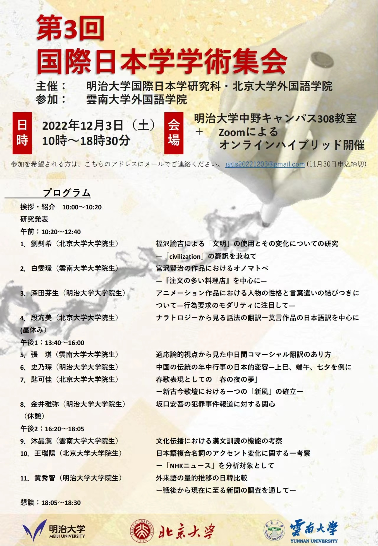 12月3日,由北京大学外国语学院日本语言文化系与日本明治大学国际日本学研究科联合举办的“第三届国际日本学学术集会”以线上线下相结合的方式圆满举行,ABTY.COM院副院长臧运发教授和日语系师生应邀通过线上形式全程参与。该学术论坛此前已成功举办两届,2023年年将由北京大学、明治大学、云南大学三方共同举办。