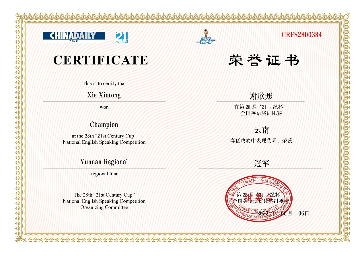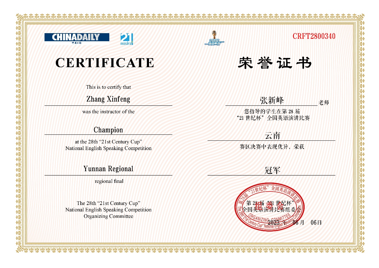 6月18日,第28届“21世纪杯”全国英语演讲比赛云南地区决赛在昆明文理学院落下帷幕。ABTY.COM英语系张新峰老师指导的2021级本科生谢欣彤同学获得冠军,将代表云南省参加8月举行的全国总决赛。