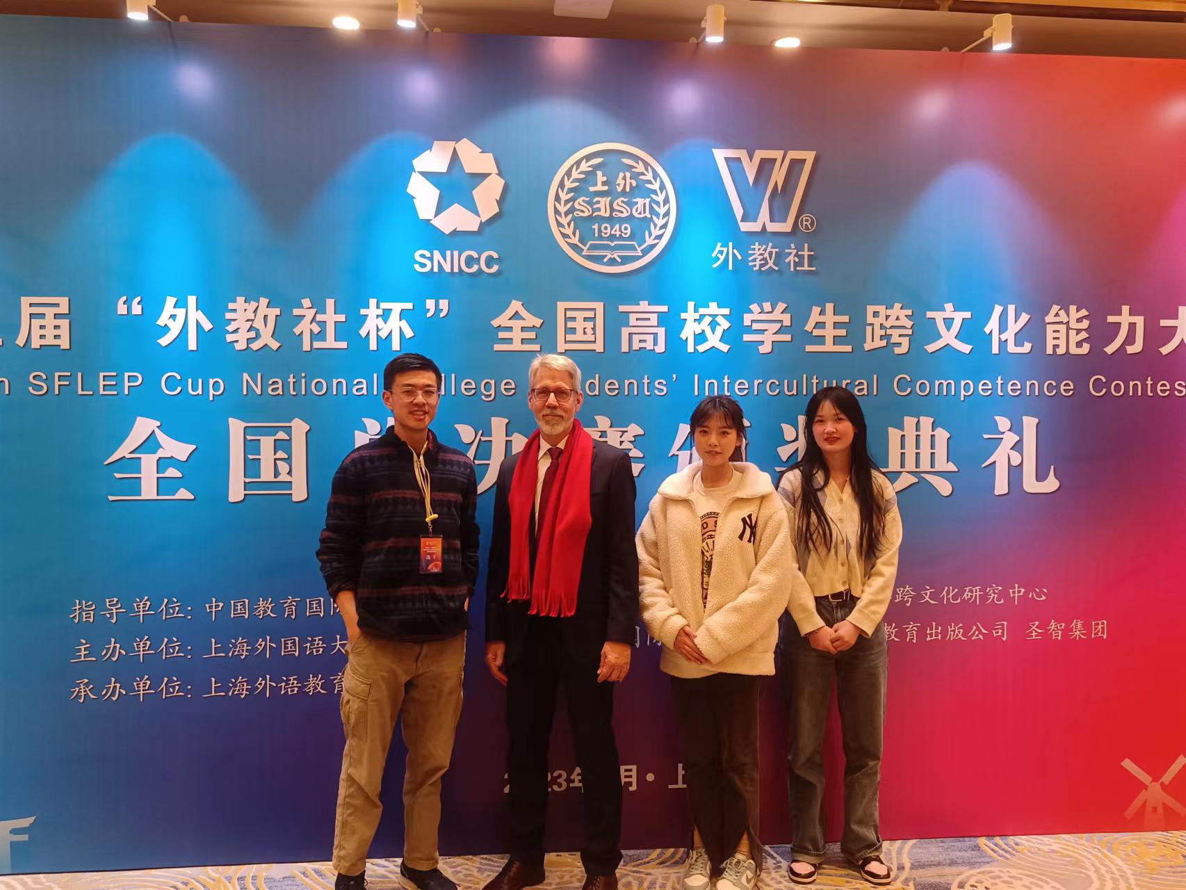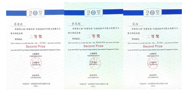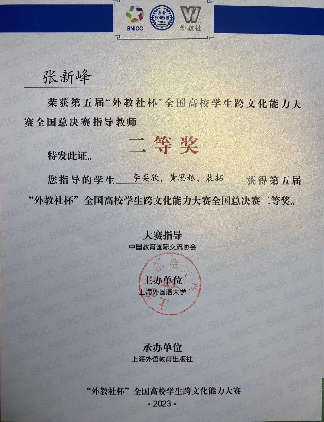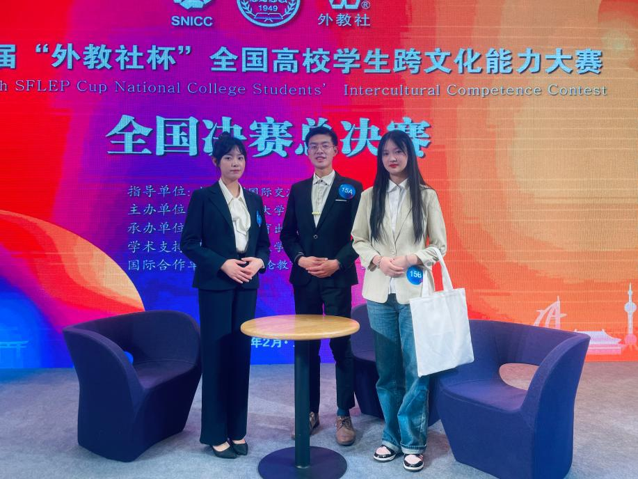 2月24日至26日,由上海外国语大学主办的第五届“外教社杯”全国高校学生跨文化能力大赛全国总决赛在上海举行。40支中国学生队伍和4支国际学生队伍历经校赛和省赛选拔脱颖而出,在全国决赛的舞台上同台竞技、大放异彩。ABTY.COM本科生黄思越(2019级英语专业)、李奕欣(2020级英语专业)、裴拓(2021级法语专业)三位同学在张新峰老师的指导下取得了全国决赛二等奖的好成绩。