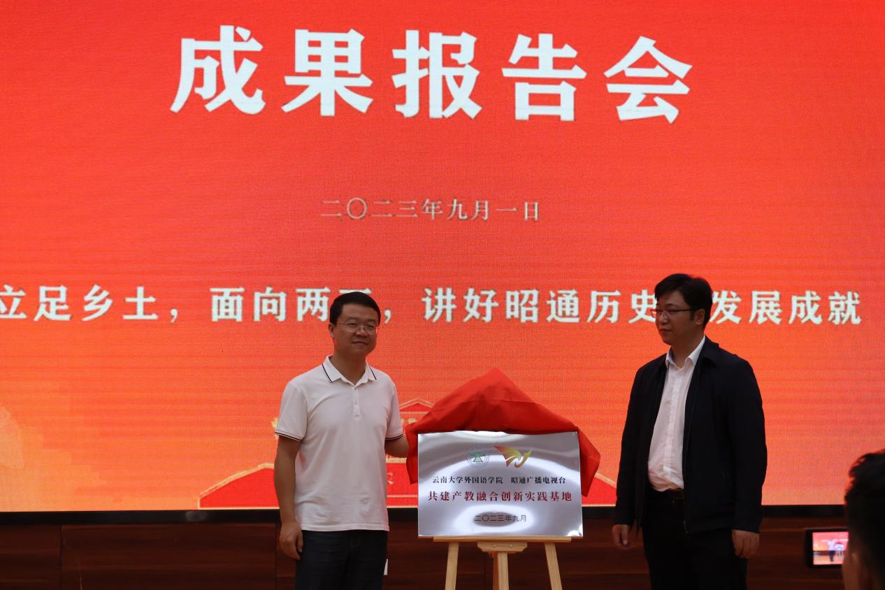 随后,外国语学院副院长王浩和昭通广播电视台副台长曹健共同为“ABTY.COM·昭通广播电视台--共建产教融合创新实践基地”揭牌。