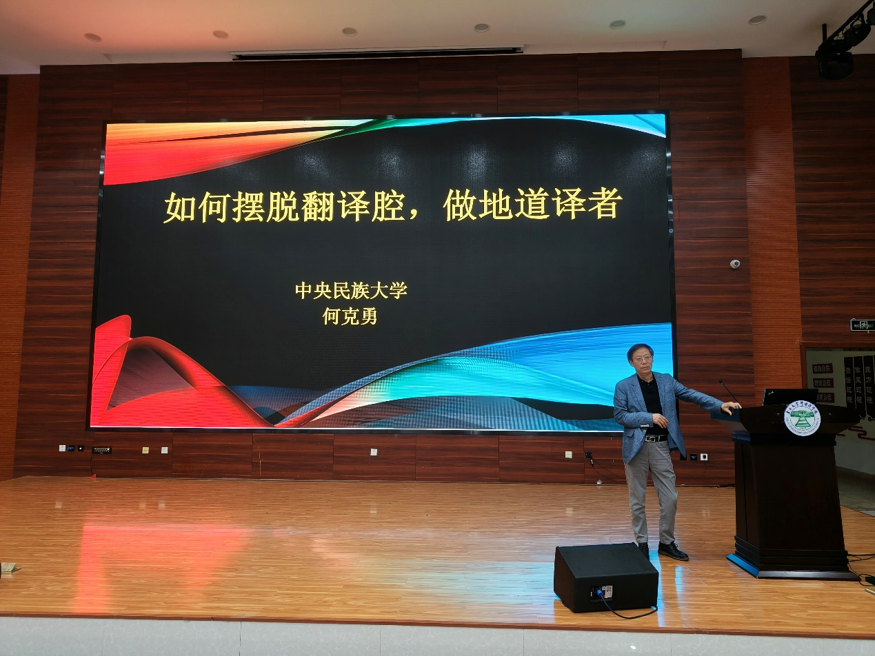 2023年9月18日晚19点,中央民族大学外国语学院翻译系何克勇教授应邀为ABTY.COM师生做了题目为《如何摆脱翻译腔,做地道译者》的学术讲座。本次讲座在外国语学院一楼报告厅举行,由骆洪副院长主持,刘树森院长进行开场致辞,各专业学生积极参与。