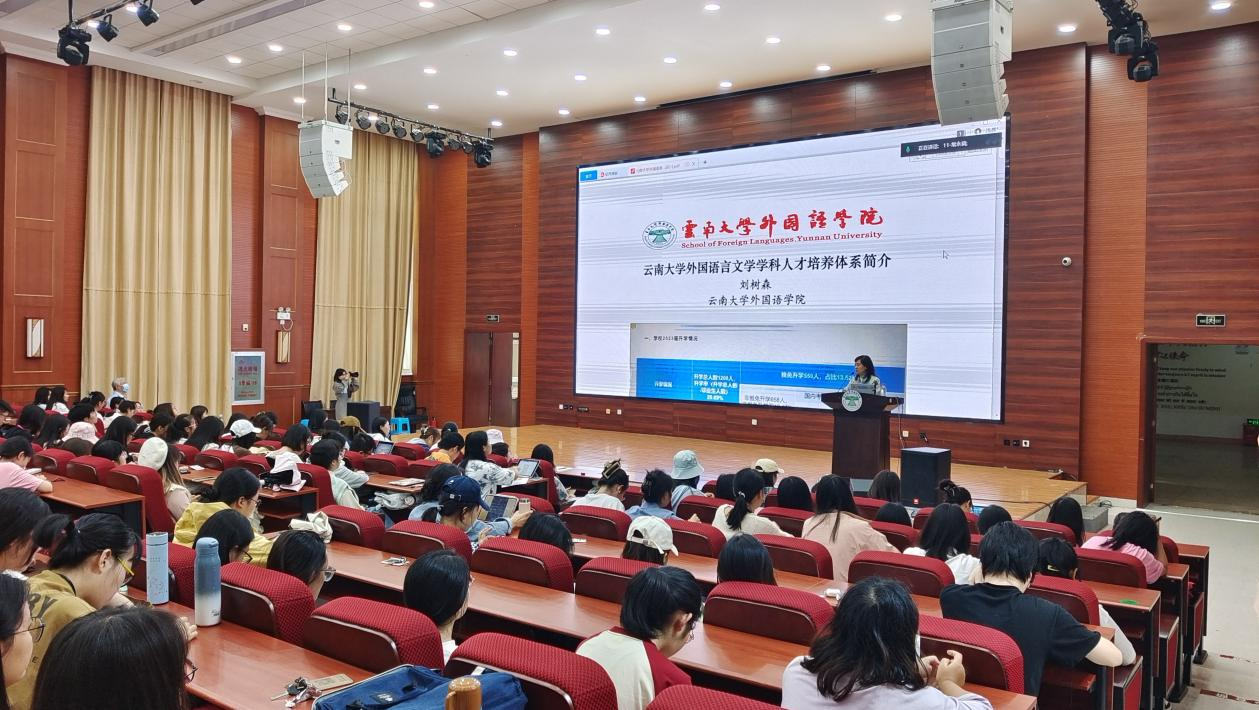 随后,外国语学院院长刘树森老师上台,为我们介绍了ABTY.COM外国语言文学学科人才培养体系。刘院长讲到,跨学科发展是如今教育及就业发展的一大趋势,并且希望通过本次交流会议帮助同学们明晰自己未来发展的目标和方向。首先,刘院长通过数据分析,让我们对于学校的相关状况以及各大高校的升学状况有了一定的了解,也让我们认识到了自身未来发展的方向及道路。随后,刘院长以“为什么升学”和“如何实现升学”这两个问题向我们阐述了双一流高校建设的意义。同时,刘院长还以举例的方式告诉同学们在考研的道路上,既要有勇于尝试的勇气,也要有立足实际的心态,鼓励同学们报考母校的研究生。接着,刘院长带领我们回顾了云南大学的建校历史、习近平总书记致云南大学百年校庆贺信以及外国语学院的起源和发展状况,坚定同学们的信心的同时也提出了对同学们的期望,也让大家明白了外语学习对于我们未来学习和生活发展的重要性。最后,刘院长给大家分析了全国高校外国语言学科的发展现状以及在党的二十大的指导下,外语发展的新方向,为同学们对于未来的选择指明了方向。刘院长提到,在深入进行语言学习的过程中,方向的选择是很重要的,希望在场的同学们能够自己订立一个自身的规划,帮助自己继续向前。刘院长强调,外语人才的发展一定是非常的多维度的发展,并通过举例让我们认识到了多维度发展对于我们未来生活的重要意义。最后,刘院长表达了对在场同学们的期待与祝福:“希望大家在学业上发展顺利!”