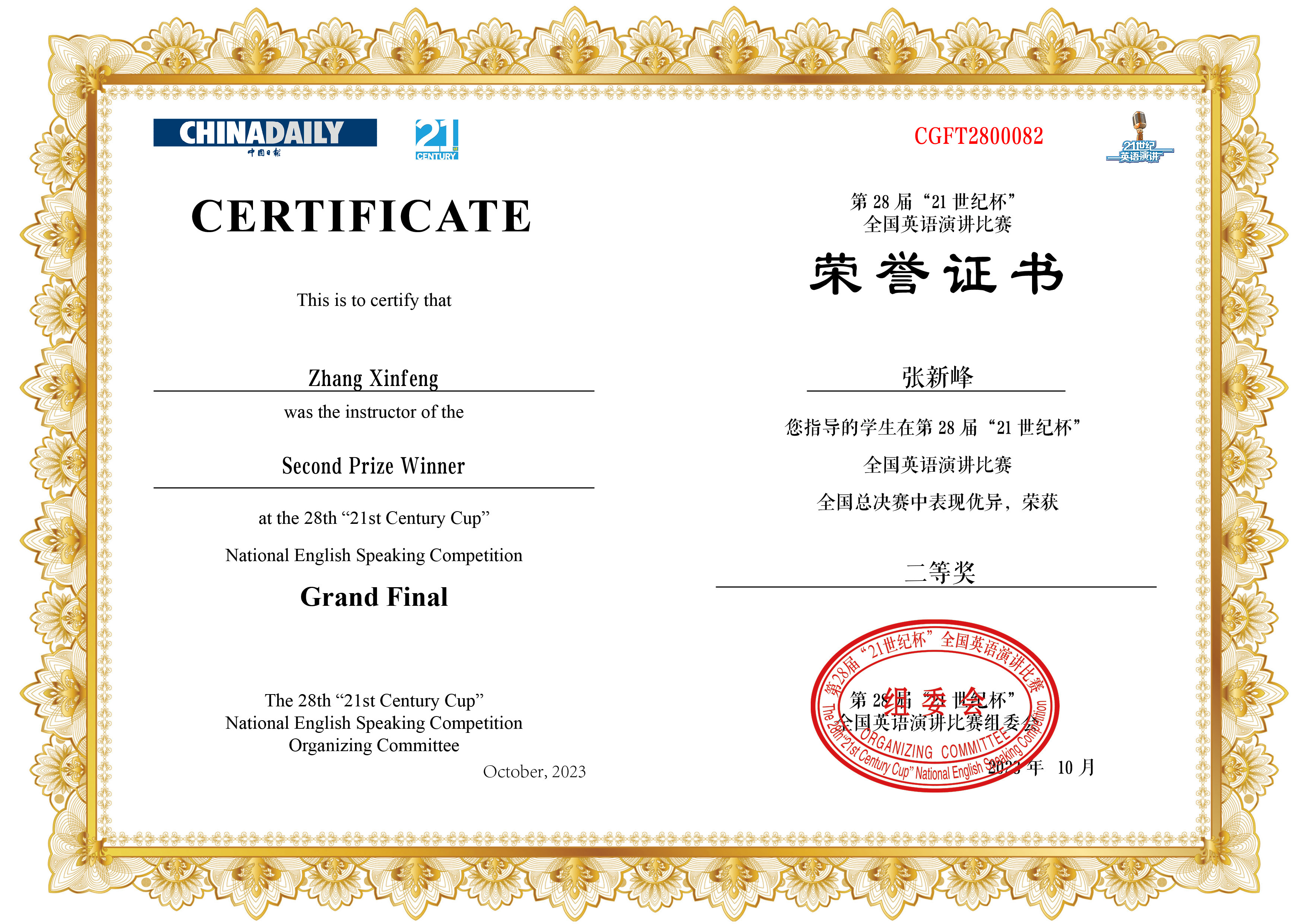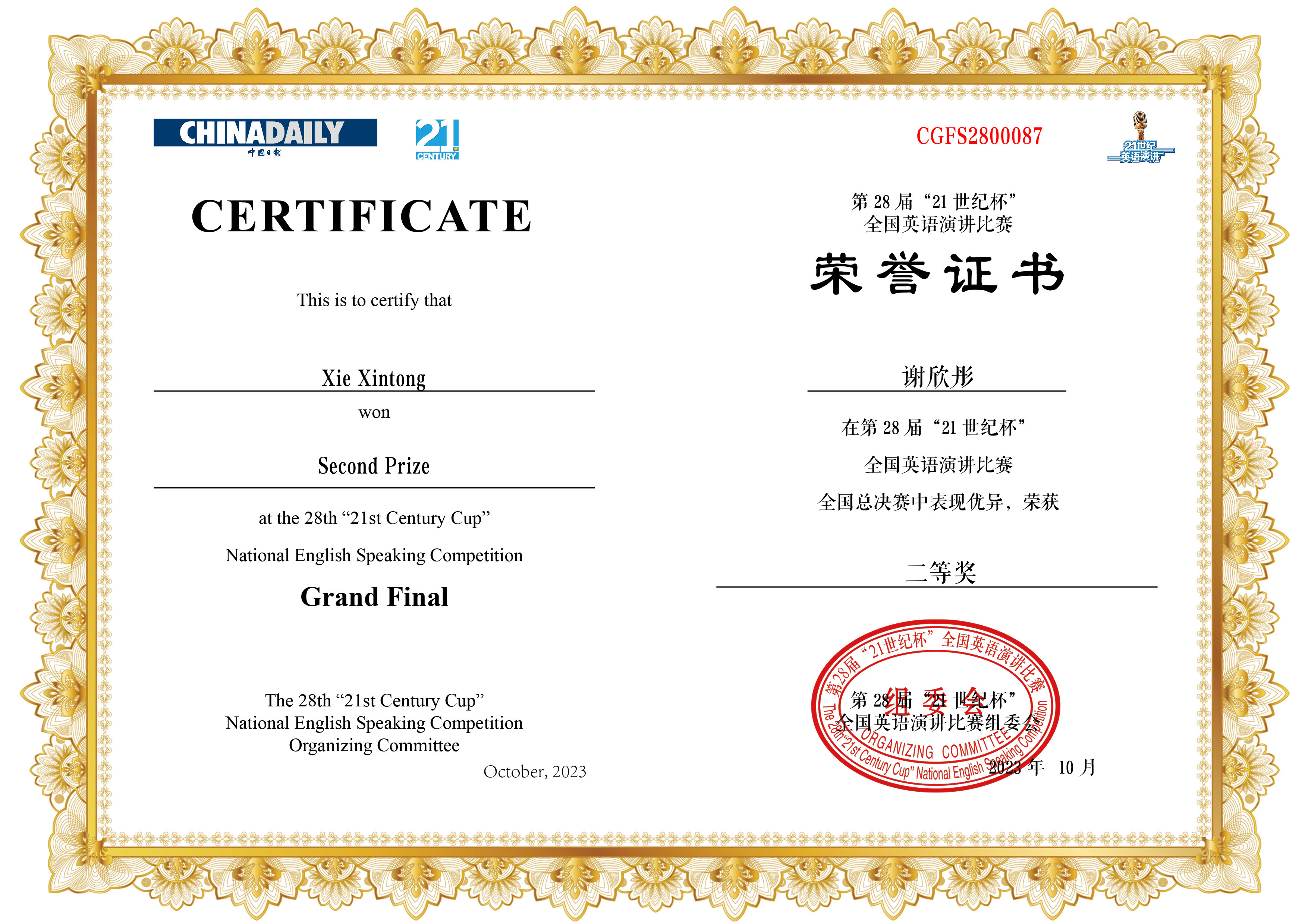 10月10日至13日,第28届中国日报社“21世纪杯”全国英语演讲比赛全国总决赛在江苏太仓举行,ABTY.COM英语专业2021级本科生谢欣彤同学在张新峰老师的指导下表现突出,荣获全国二等奖。