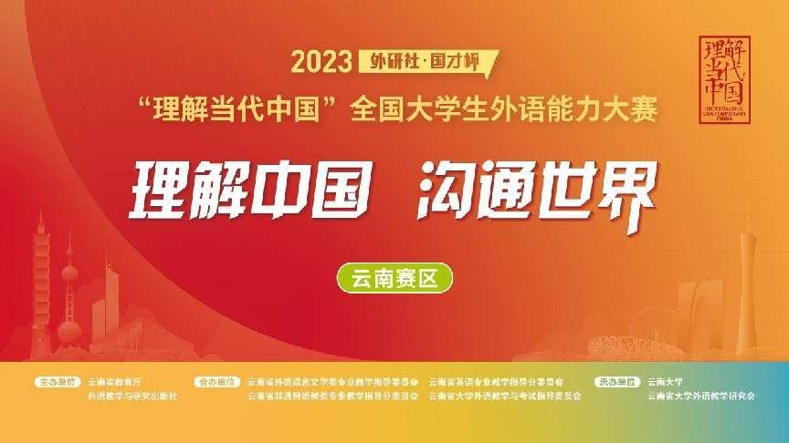 2023“外研社·国才杯”“理解当代中国”全国大学生外语能力大赛由云南省教育厅、外语教学与研究出版社主办,云南省外国语言文学类专业教学指导委员会、云南省英语专业教学指导分委员会、云南省非通用语种类专业教学指导分委员会、云南省大学外语教学与考试指导委员会合办,云南大学、云南省大学外语教学研究会承办。10月28-29日,“英语阅读”“英语写作”“英语笔译”“泰语综合”的云南省复赛以选手线上参赛的形式举行。11月2-3日,“英语演讲”“英语口译”的云南省复赛在ABTY.COM举行。