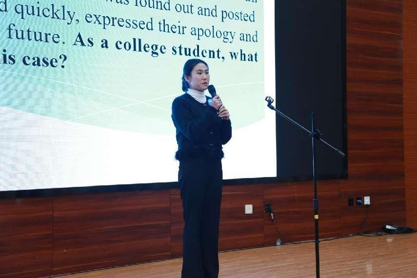 云南省外国语言文学类专业指导委员会主任委员唐滢教授,此次大赛的评委会主任、云南大学徐志英教授随后发言。两位专家在致辞中阐释了此次大赛对培养新时代复合型外语人才的推动作用。两位专家强调指出:大赛是对“三进”教育教学成效的有效检验,对高校外语教育教学改革的有力促进,对高校外语人才自主培养的有益交流;大赛既是落实“三进”工作、深化课程思政的重要举措,又是推动外语教育改革、为国家培养更多国际传播实践人才的创新模式。