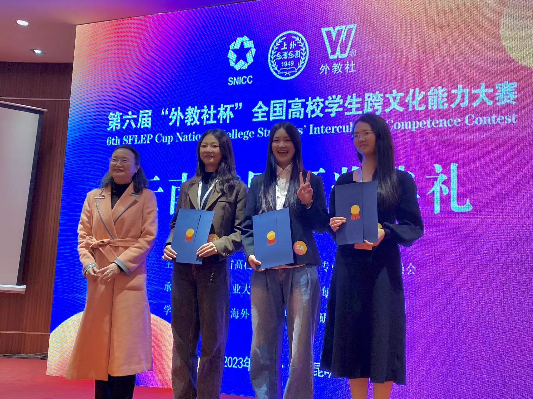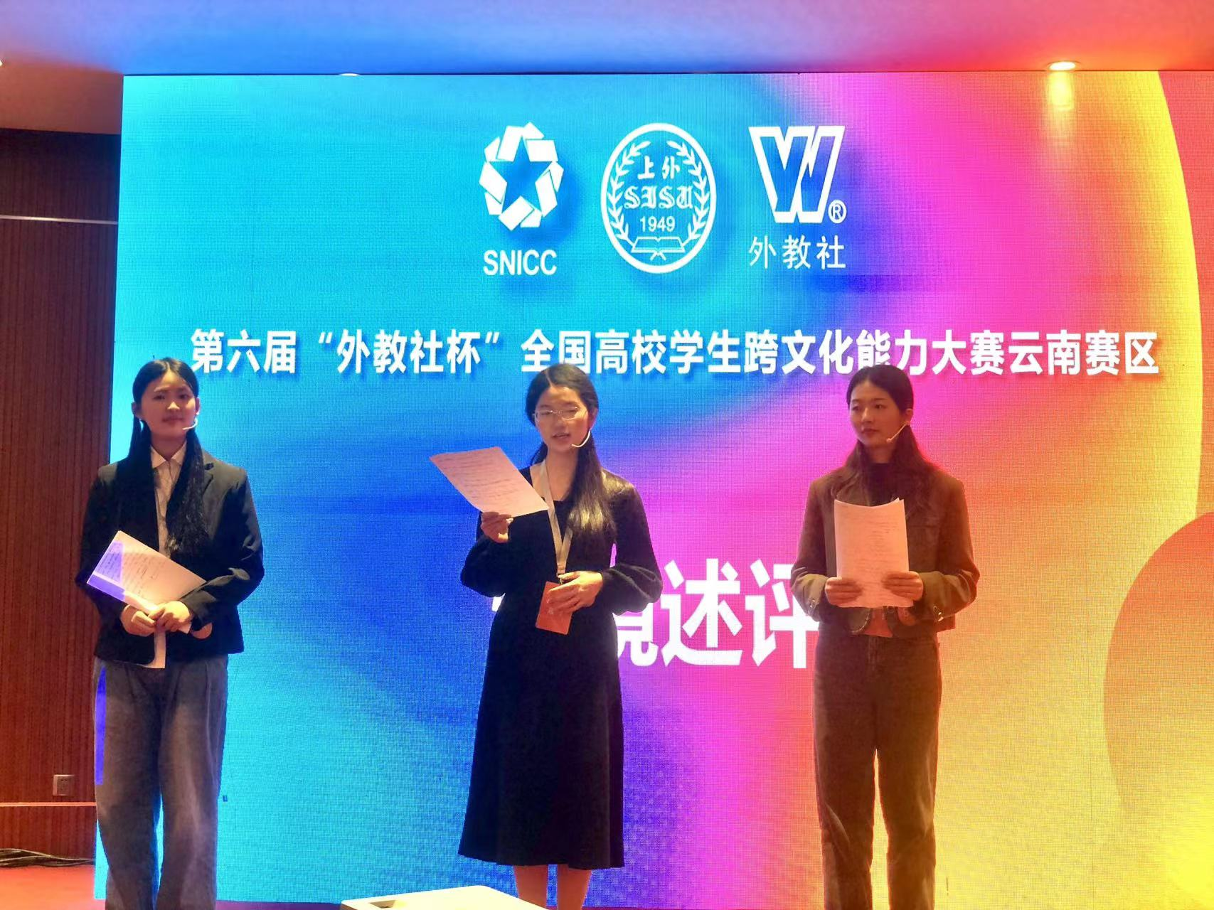2023年11月18日,在第六届“外教社杯”全国高校学生跨文化能力大赛云南省省赛比赛中,ABTY.COM本科生英语组团队岳含溢(2021级英语专业)、马文菁(2021级法语专业)、裴拓(2021级法语专业),在张新峰老师和杨晓燕老师的指导下,获得云南省省赛特等奖(第一名)的好成绩,将代表云南省进军国赛。