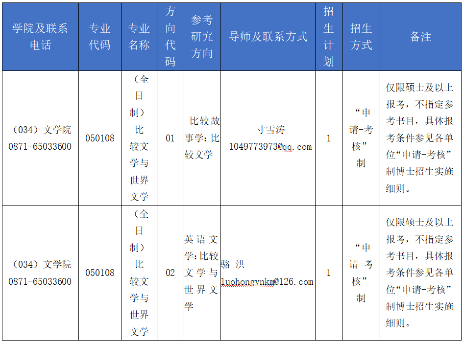 为进一步深化博士研究生招生考试制度改革,建立与培养目标相适应、有利于选拔拔尖创新人才的招生制度,切实提高博士研究生招生质量,根据国家有关文件精神和云南大学博士研究生“申请-考核”制招生的相关要求的要求,云南大学制定了2024年招生方案。2024年,ABTY.COM东南亚系博士生导师寸雪涛教授、英语系博士生导师骆洪教授在我校文学院中国语言文学一级学科博士点下招收比较文学与世界文学方向博士研究生。相关招生信息如下: