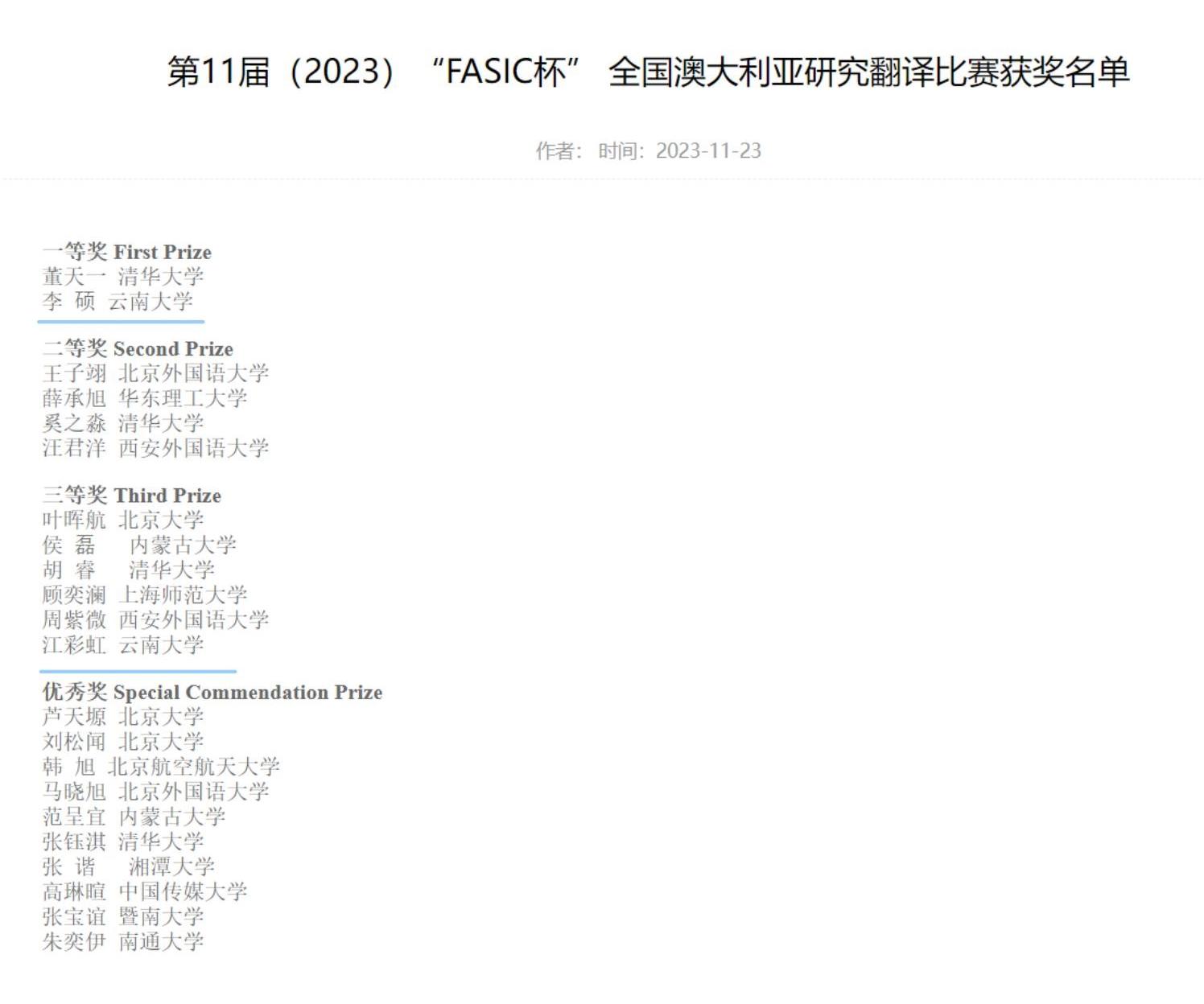 为促进中国高校学生对澳大利亚社会和文化的深入了解,北京外国语大学澳大利亚研究中心自2013年起组织举办年度澳大利亚研究翻译比赛,由在华澳大利亚研究基金会(FASIC,全称:Foundation for Australian Studies in China)提供赞助,2023年9月19日至25日举办了第11届比赛。ABTY.COM2022级英语笔译研究生李硕、江彩虹表现突出,分别荣获本届比赛一等奖(与清华大学学生排名相同)、三等奖。