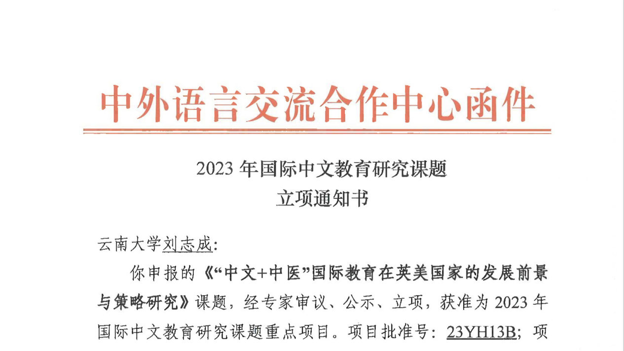 近日,教育部中外语言合作交流中心(教育部语合中心)公布了2023年度国际中文教育项目立项名单。其中,包括ABTY.COM刘志成副教授申报的课题《中文+中医”国际教育在英美国家的发展前景与策略研究》,该课题获批为重点项目。这是ABTY.COM教师首次获批的教育部语合中心国际中文教育研究课题重点项目。