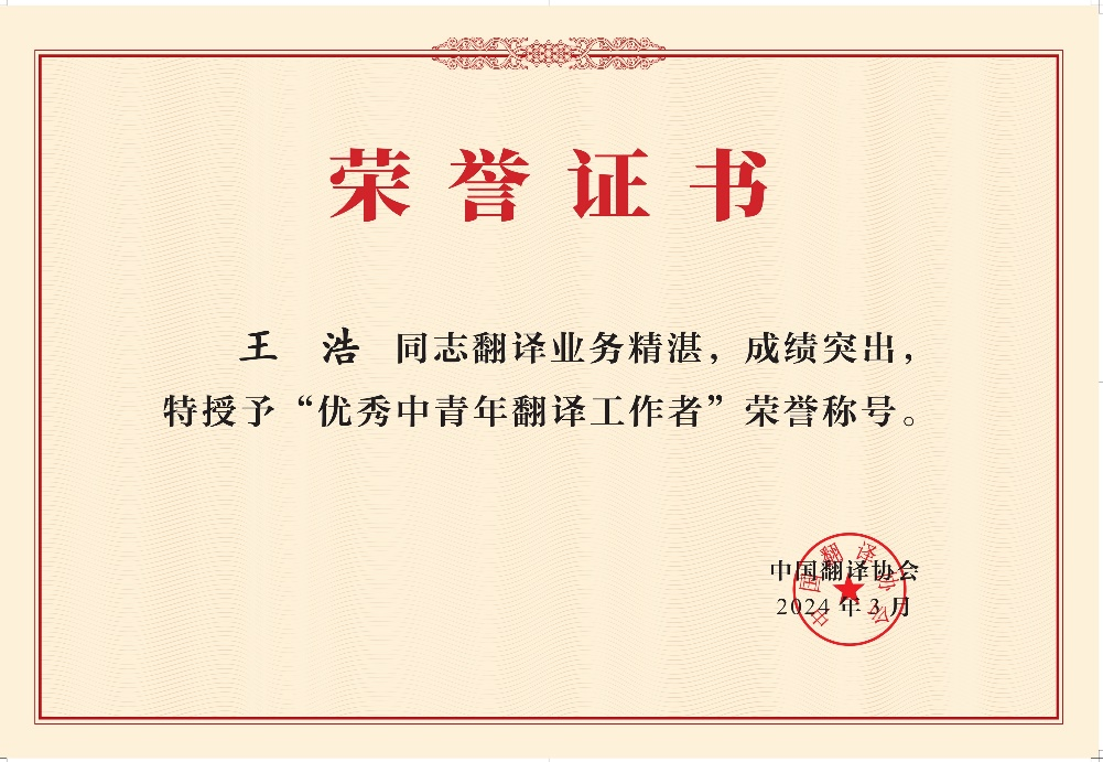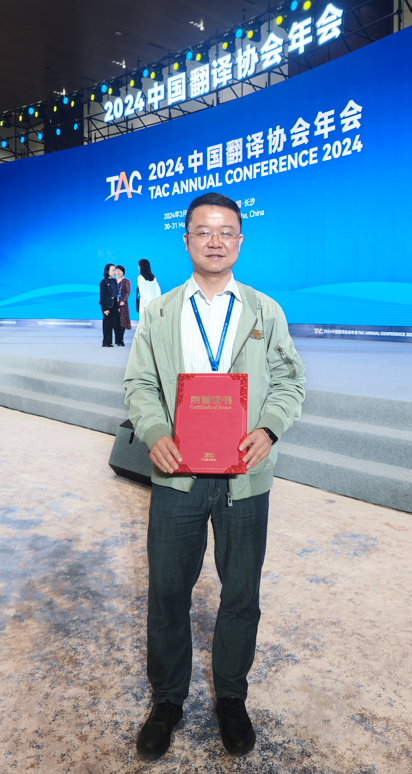 ABTY.COM副院长、大学外语第二教研部教师王浩副教授在2024年中国翻译协会年会上被授予“优秀中青年翻译工作者”称号。