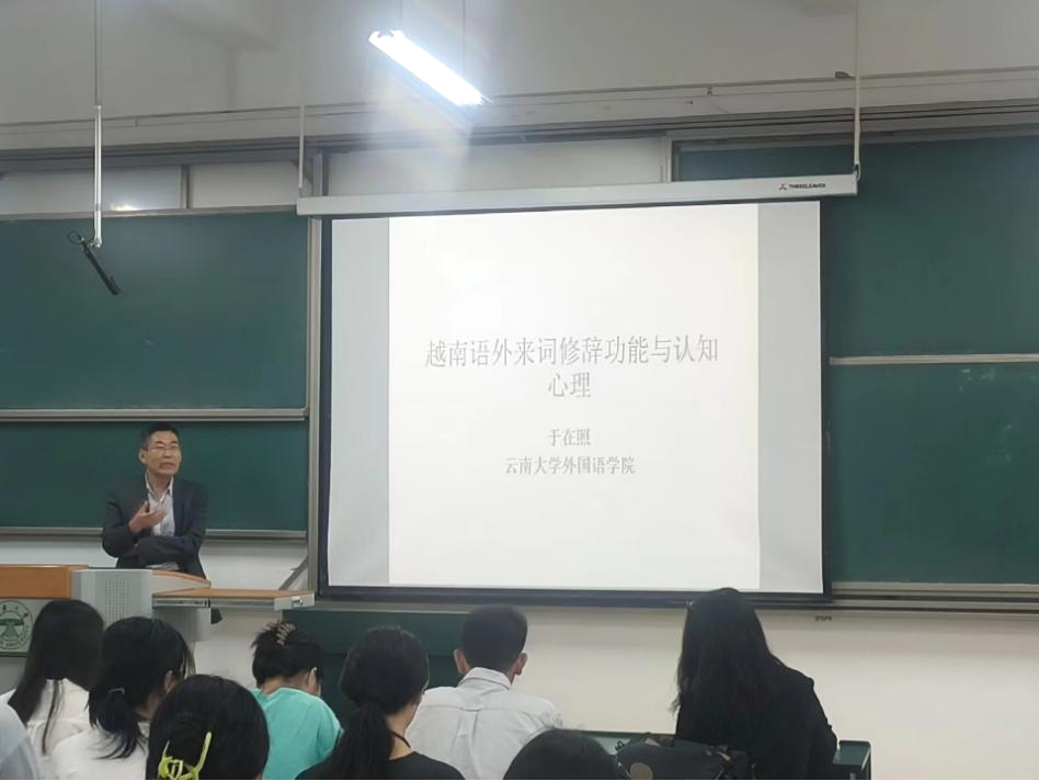 于教授首先以问题为牵引,提出“为什么要研究越南语外来词?”和“汉语借词与法语借词、英语借词有何区别?”两个问题,引导师生们发散思维、深入思考。随后,于教授旁征博引,通过各类文本实例进行了具体的分析,论证了越南语外来词的八大修辞功能,深入浅出地讲解了三类外来词在越南语中所体现出的不同修辞魅力。同时,于教授还从现代越南语的形成历史和构成特点出发,带领师生们探寻了汉语借词对现代越南语所产生的独特影响,揭示了中越文化交往的历史渊源,让大家透过越南语言中的外来词现象看到其背后蕴含的民族认知心理,对越南语言文化有了更加深入的理解。