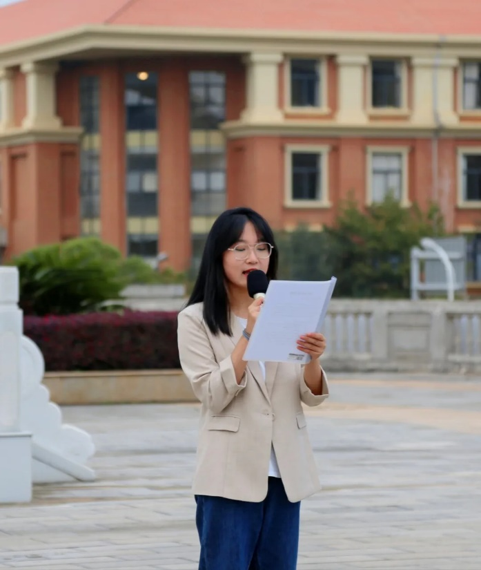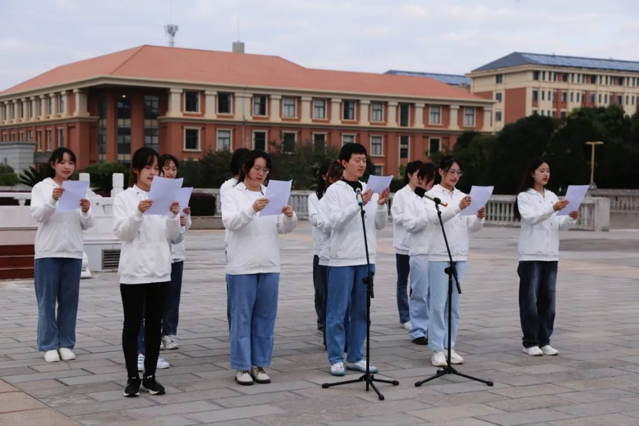 随后,外国语学院2020级、2021级14名同学为我们带来“喜迎二十大,奋进新征程”主题朗诵。铿锵有力的朗朗诵读声飘扬在广场上,深深激发了同学们的爱党爱国热情,坚定了同学们奋发进取的信念。