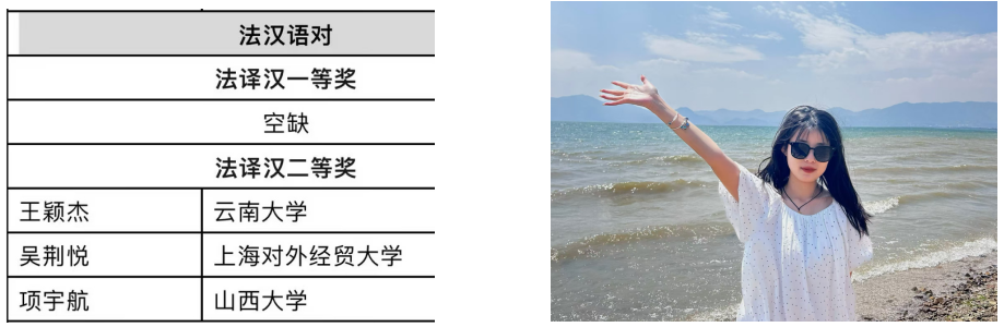 近期,ABTY.COM法语系研究生在各级各类大赛中荣获佳绩。10月16日,第三十六届韩素音国际翻译大赛获奖名单揭晓,2023级法语笔译研究生王颖杰同学荣获“法汉语对-法译汉”组二等奖;10月27日,2023级法语笔译研究生李倩同学获得中国外文局主办的“2024年多语种商务翻译大赛-法语组一等奖”。