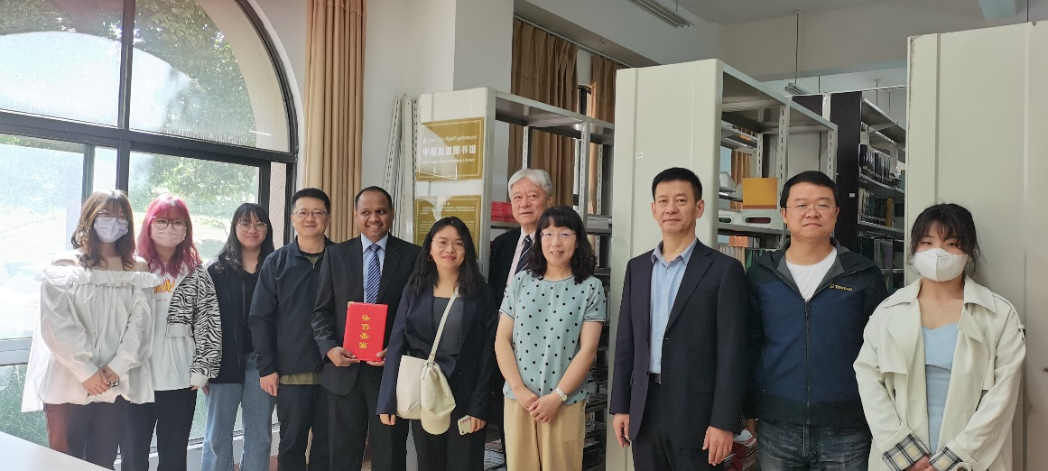 学院党政领导、僧伽罗语专业师生、外教苏噶特先生在“中斯友谊图书馆”揭牌仪式上合影