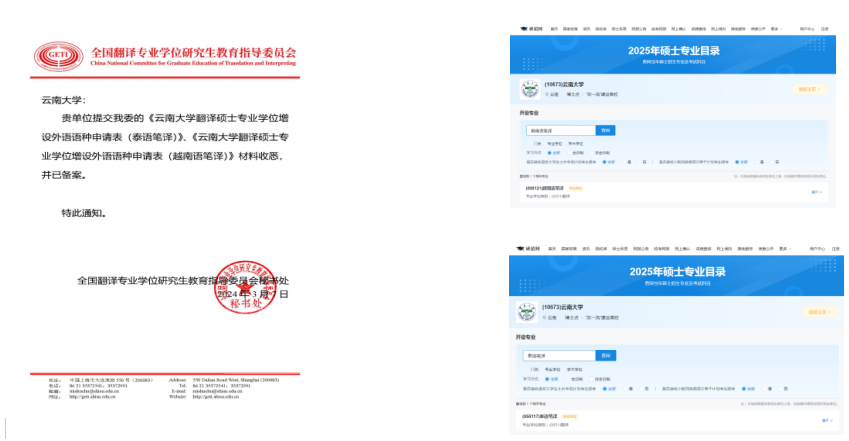 2024年3月,收到全国翻译专业学位研究生教育指导委员会秘书处回复,新增泰语专业笔译方向(代码055117)、越南语专业笔译方向(代码055121)的申请获准备案。在大学研究生院的指导下,ABTY.COM已将以上两个专业方向列入2025年招生计划,实现了首次招生,是ABTY.COM非通语种专业取得的突破性发展,为云南大学下一轮“双一流”建设做出了应有的贡献。