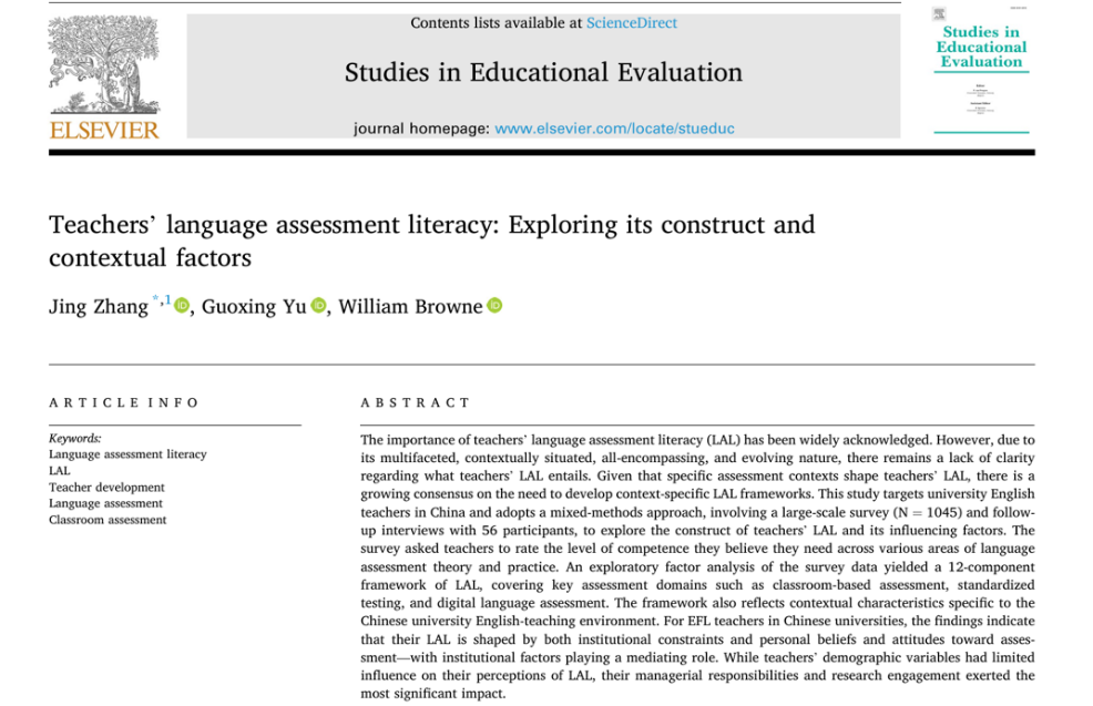 作为国家级一流本科专业建设点,ABTY.COM英语系最近陆续发表了若干重要研究成果,其中包括张晶博士11月在国际知名教育评估类SSCI收录核心期刊Studies in Educational Assessment上发表题为“Teachers' Language Assessment Literacy: Exploring Its Construct and Contextual Factors”的研究论文,聚焦教师语言测评素养的构建及其影响因素,为外语教师职业发展提供了理论与实践参考。Studies in Educational Assessment由国际著名的爱思唯尔出版社(Elsevier)出版,是教育评估与测量领域的权威国际期刊,致力于推动评价设计、实施与效果等方面的创新研究,涵盖量化与质性多种研究方法,具有广泛的学术影响力。