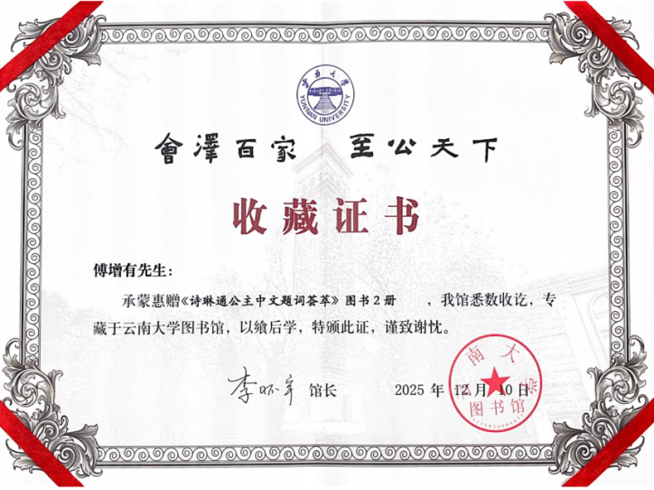 按照傅增有教授的嘱托,本次惠赠的诗琳通公主的新书, 3册存放于外国语学院资料室,2册存放于云南大学图书馆,1册存放于泰语教研室,供师生阅读欣赏。